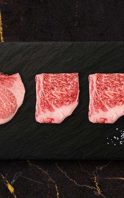 Experience the pinnacle of the beef world with a trio of intricately marbled A5 Japanese Wagyu steaks, which deliver taste, texture, and tenderness in perfect balance.