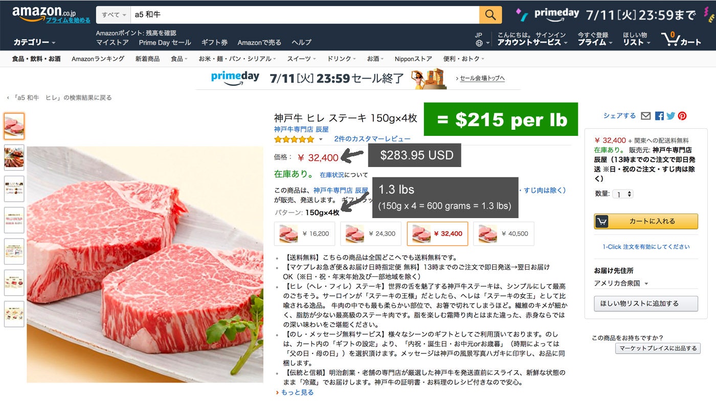 Here's A5 grade beef being sold on Amazon Japan for around $215 USD per pound.